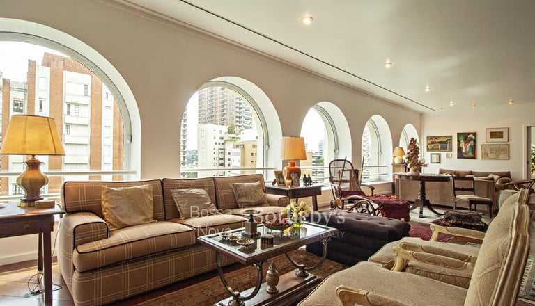 Apartamento com living para 3 ambientes, terraço gourmet com uma vista panorâmica para o Pacaembu, lavabo, escritório, 4 suítes, sala íntima, 6 vagas de garagem e depósito.